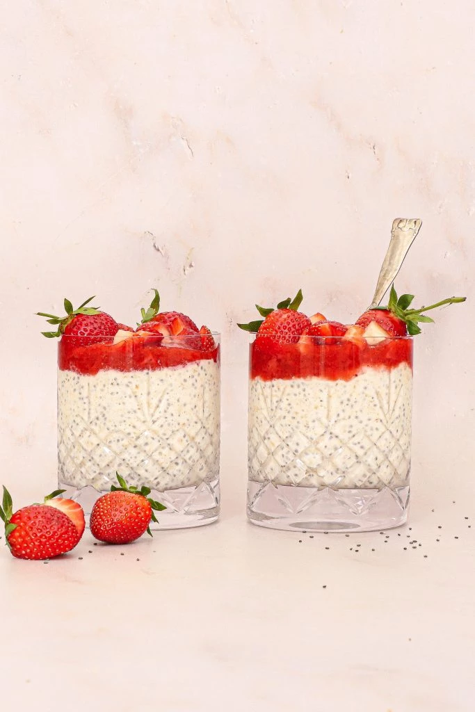 - Bland havregryn, chiafrø, vaniljesukker, salt, yoghurt og koldskål i en skål, og rør det godt sammen. Læg låg på og sæt den på køl i minimum 2-3 timer, – men gerne natten over.Du kan også fordele ingredienserne i 2 serveringsglas med låg, – sørg for at der er plads nok til topping dagen efter. Så er det nemt både at have med på farten, eller lige snuppe et glas frem om morgenen eller til en hurtig frokost.