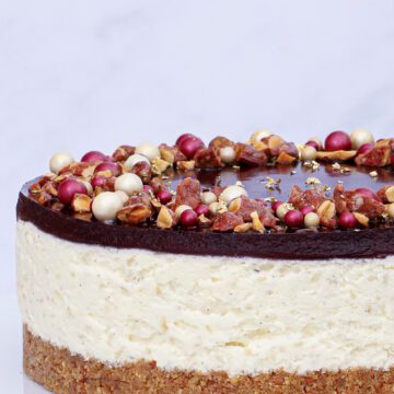 Min Risalamande Cheesecake med brændte mandler og kirsebær er netop dette – en hyldest til den elskede juledessert i en ny og fortryllende udgave.
