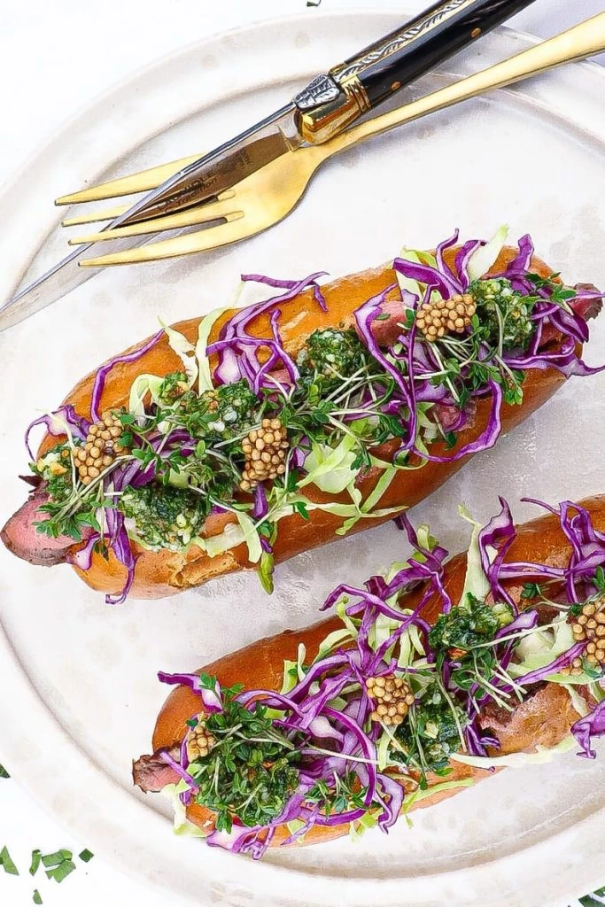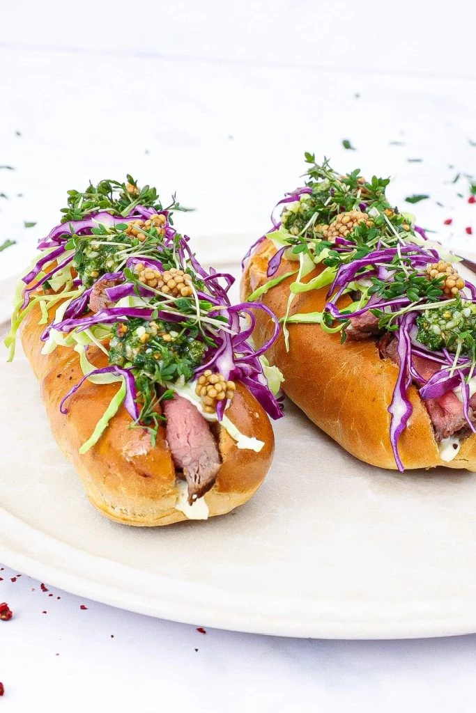 Lækre Steak Dogs fyldt med rosastegt oksemørbrad, hjemmelavet pesto, kål og karse, – en hotdog i nye klæder.